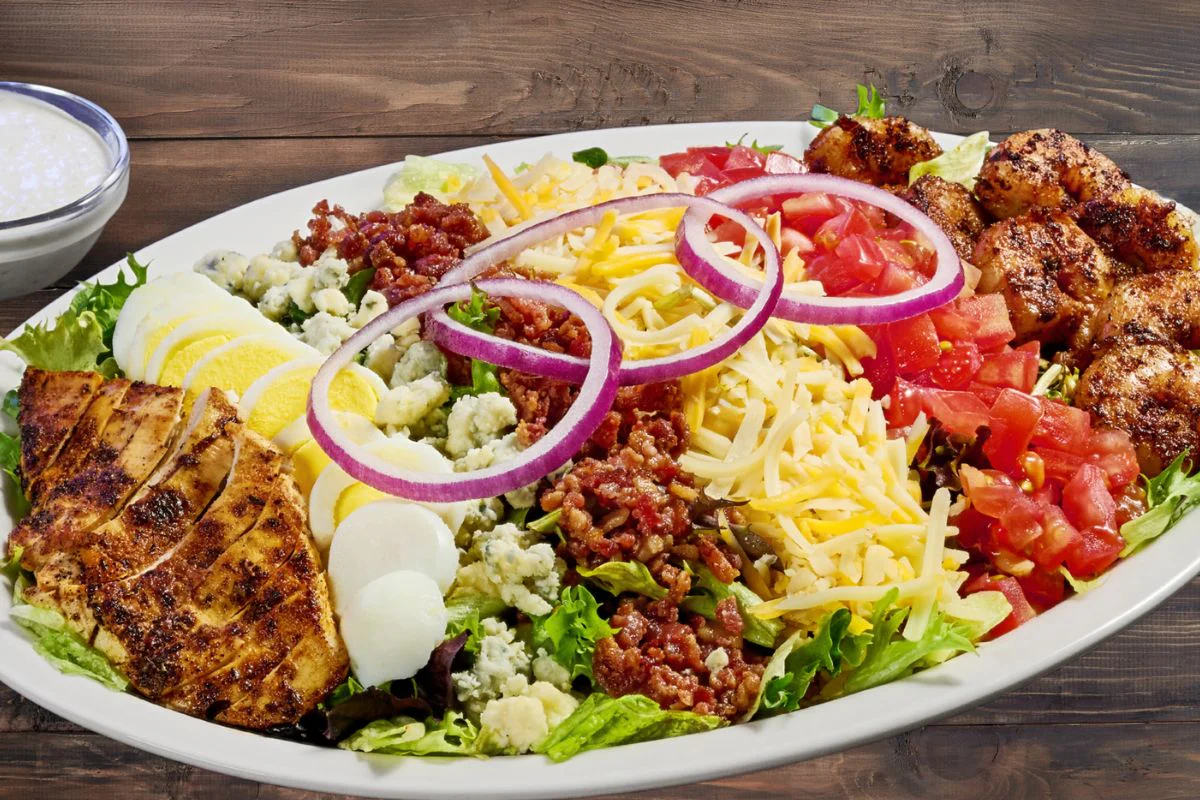 Hard-boiled egg, blended cheeses, tomatoes, red onion, applewood-smoked bacon, blue cheese crumbles, field greens.
