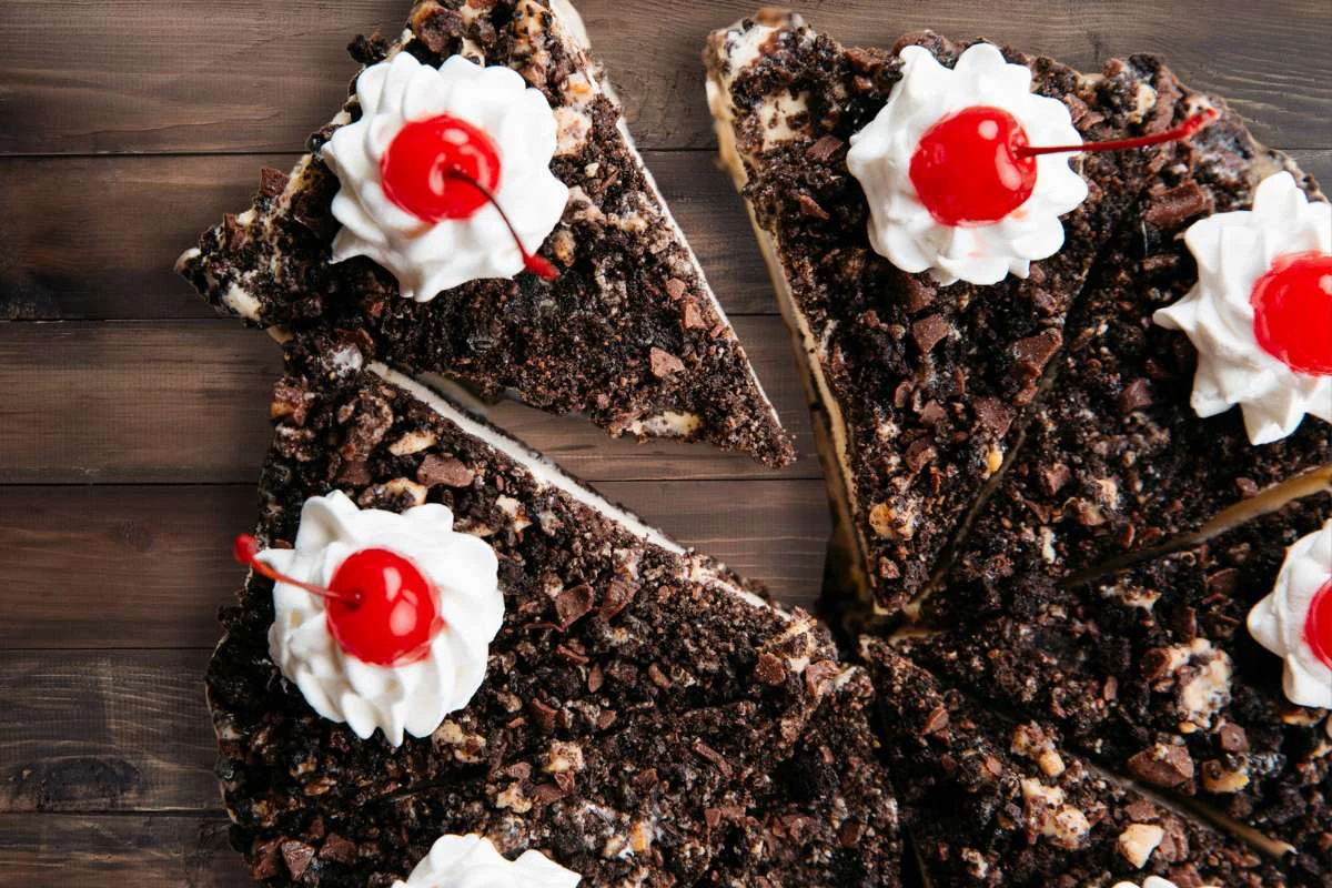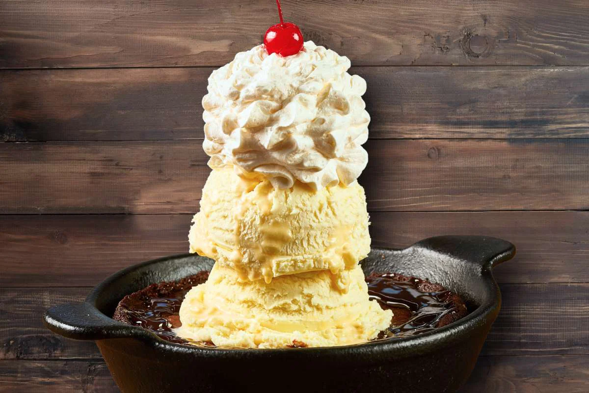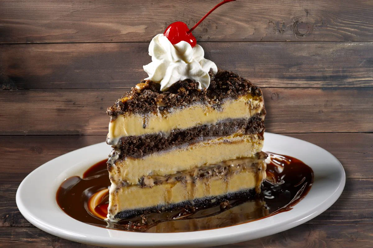 A Slice of Triple-layered vanilla ice cream cake, Oreo® cookie crust, Heath® Bar crunch crumble, caramel, hot fudge. Served with a side of whipped cream and cherry, with a side of hot fudge.