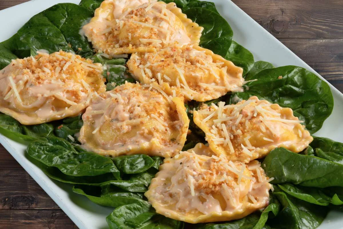 Tomato cream sauce, breadcrumbs, Parmesan cheese, on garlic spinach.