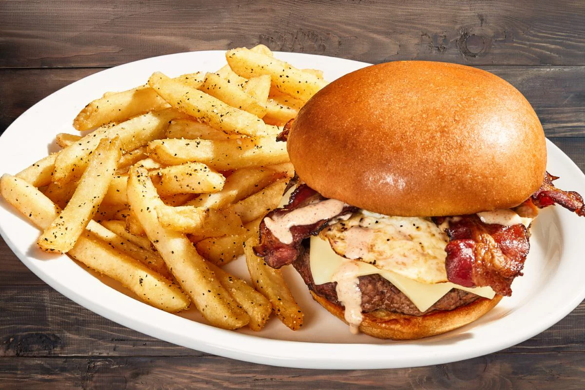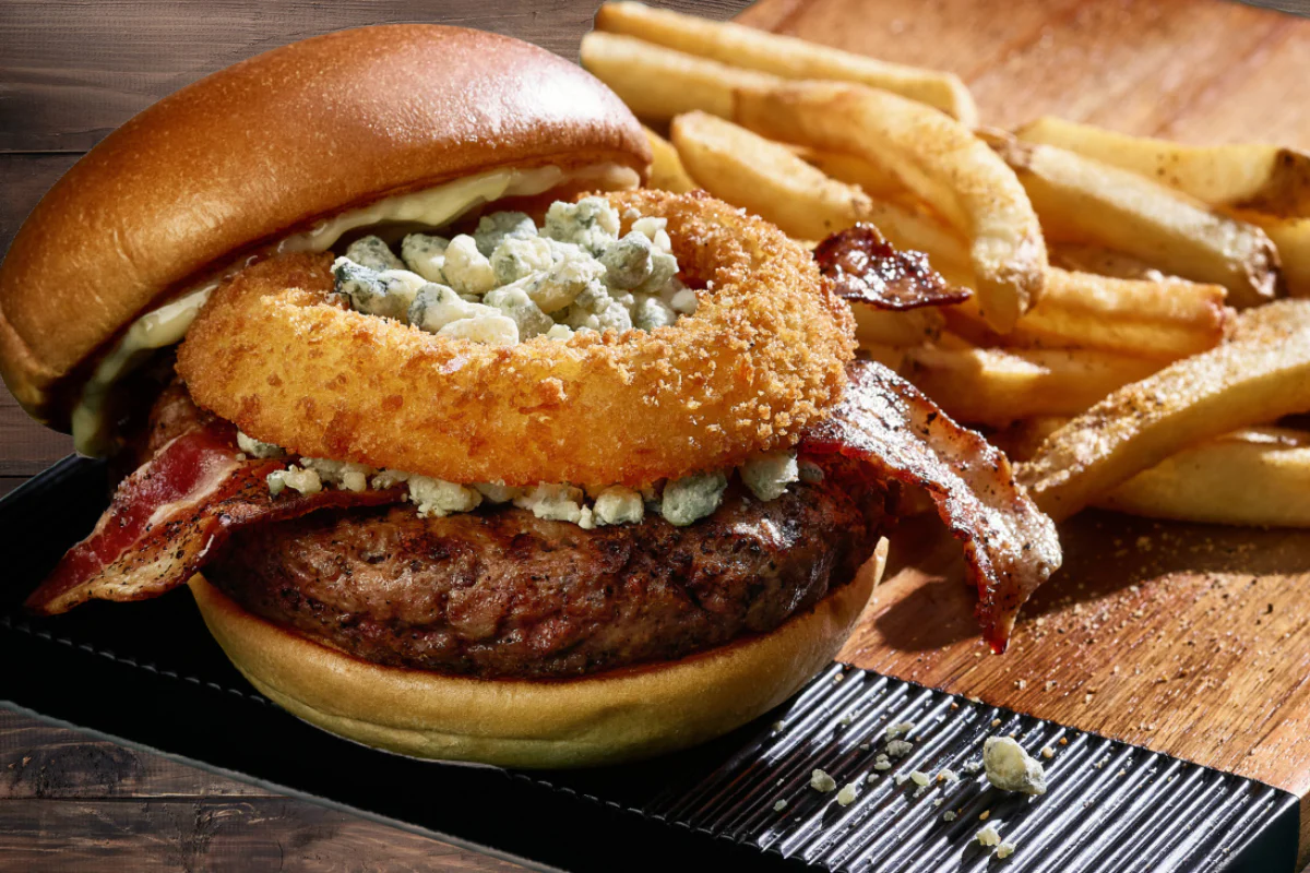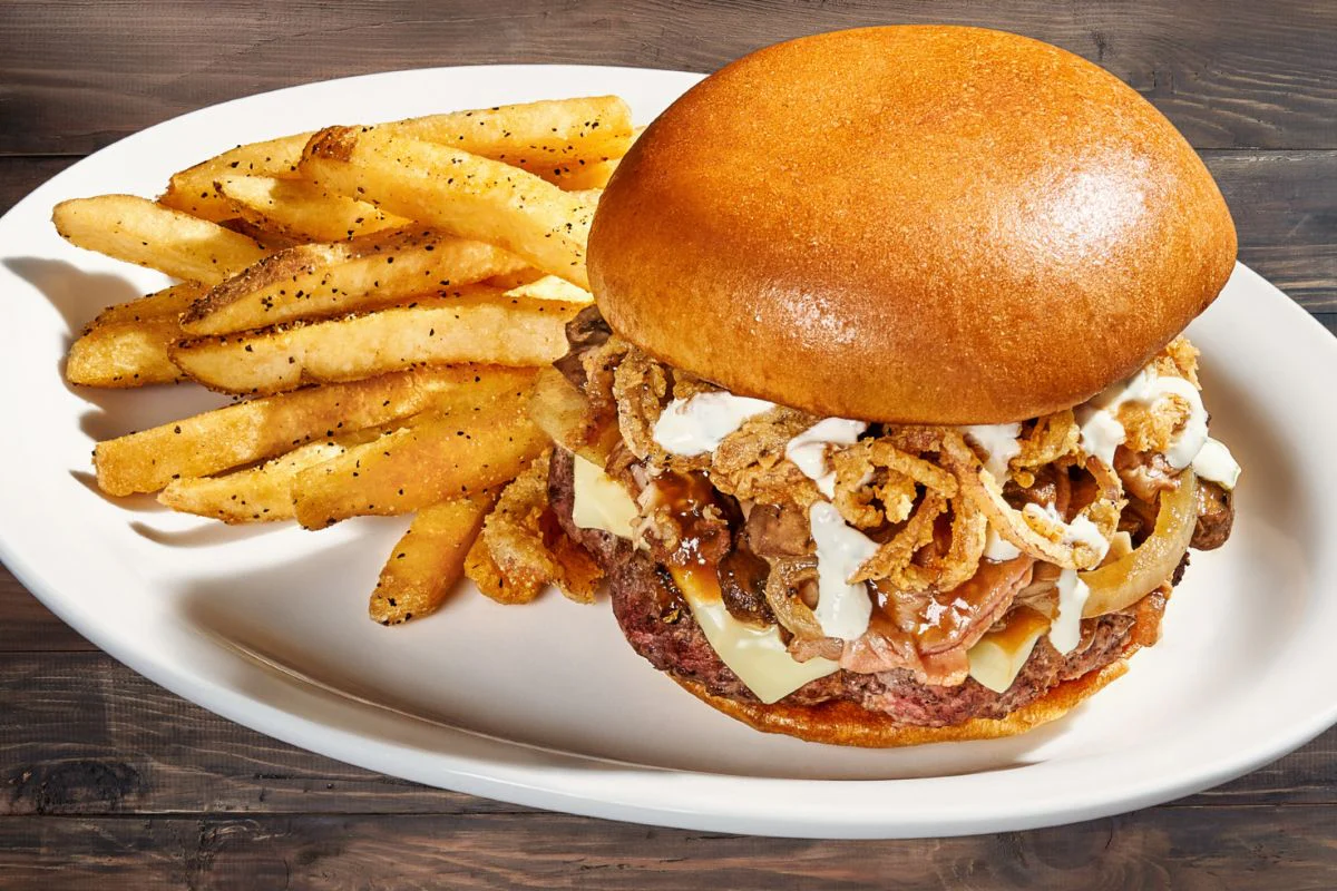 1/2-pound, premium ground-steak patty*, BBQ sauce, blue cheese, bacon, onion ring, garlic aioli on a toasted bun. Served with Fries.