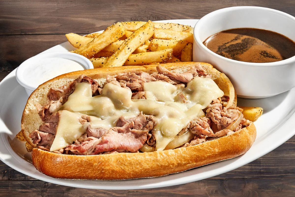 Slow-roasted prime rib, sauteed onions, Swiss. Served on an Amoroso's hoagie roll. With Au jus and house made horsey sauce on the side.