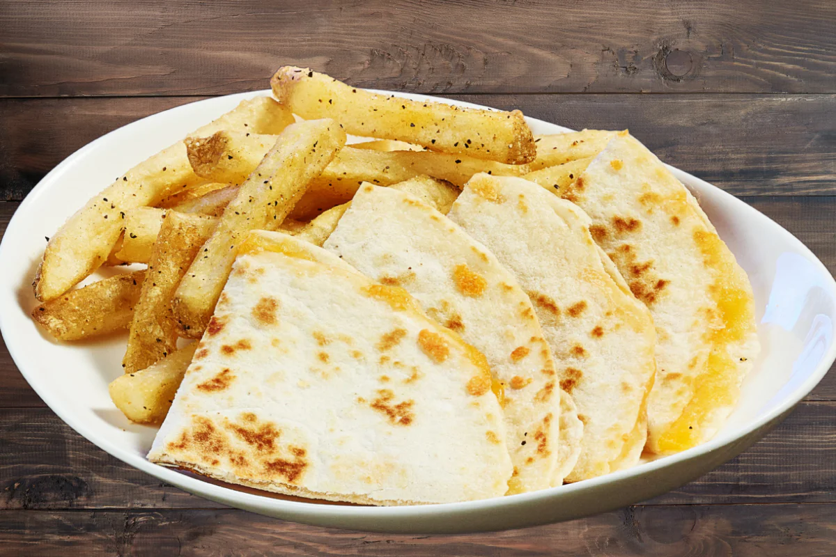 Warm flour tortilla filled with melted cheese, served with a choice of one side, a kids beverage, and a complimentary scoop of vanilla ice cream.