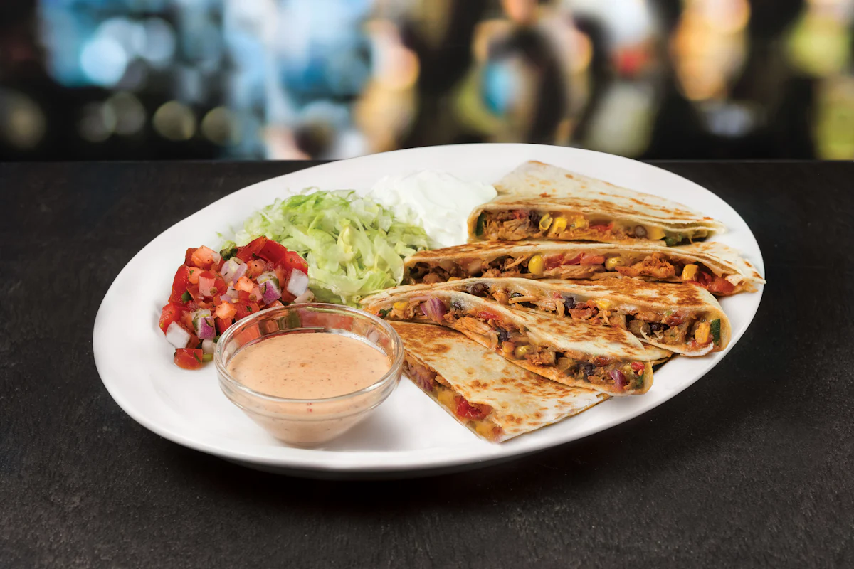 Grilled flour tortilla filled with blackened chicken, a blend of melted cheeses, pico de gallo, black bean corn salsa, drizzled with creamy red chili sauce. Served with pico de gallo and sour cream.