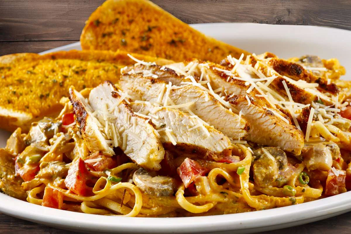 Blackened chicken breast, sautéed mushrooms, Roma tomatoes, scallions, spicy Parmesan cream sauce, fettuccine, toasted garlic bread.