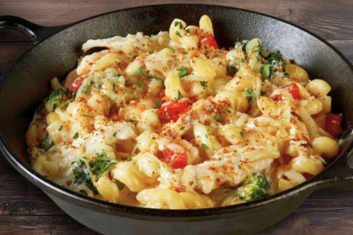 Bite-sized pieces of medium sauced Zingers®, shell pasta, creamy sauce of blended cheese, scallions, toasted breadcrumbs.