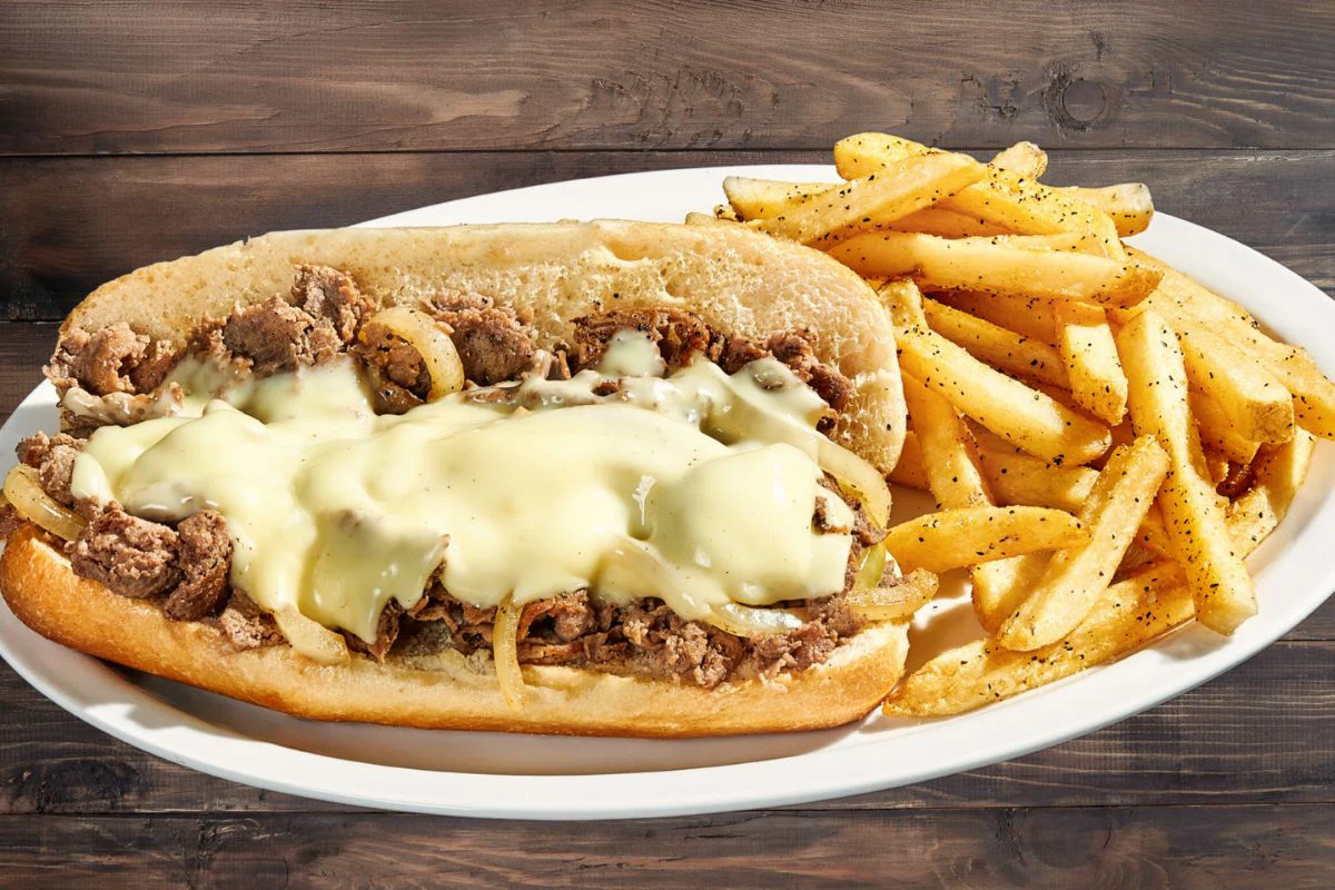 Grilled, sliced beef, sautéed onions, melted white American cheese, hoagie roll.