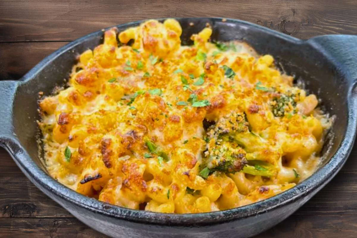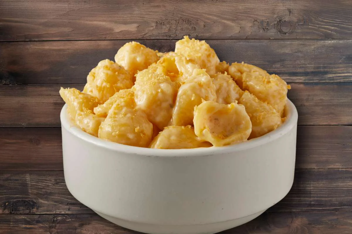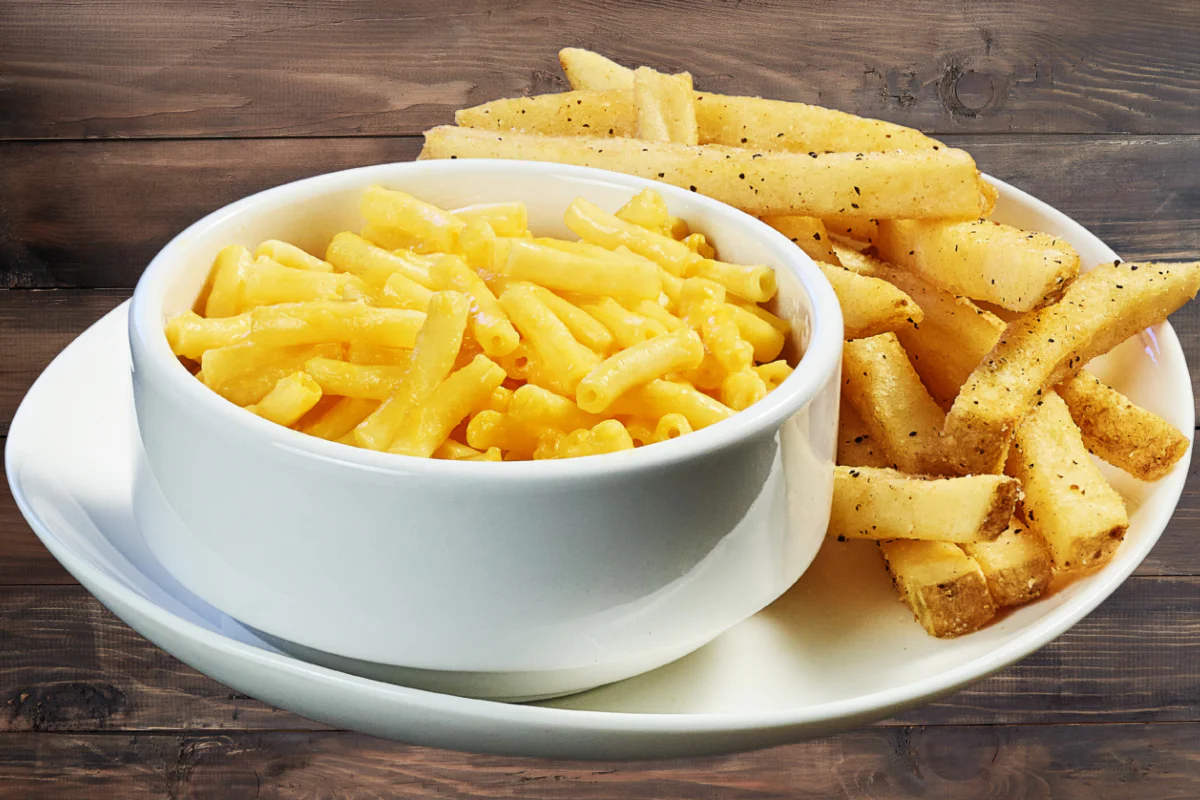 Creamy classic mac and cheese served with a choice of one side, a kids beverage, and a complimentary scoop of vanilla ice cream.