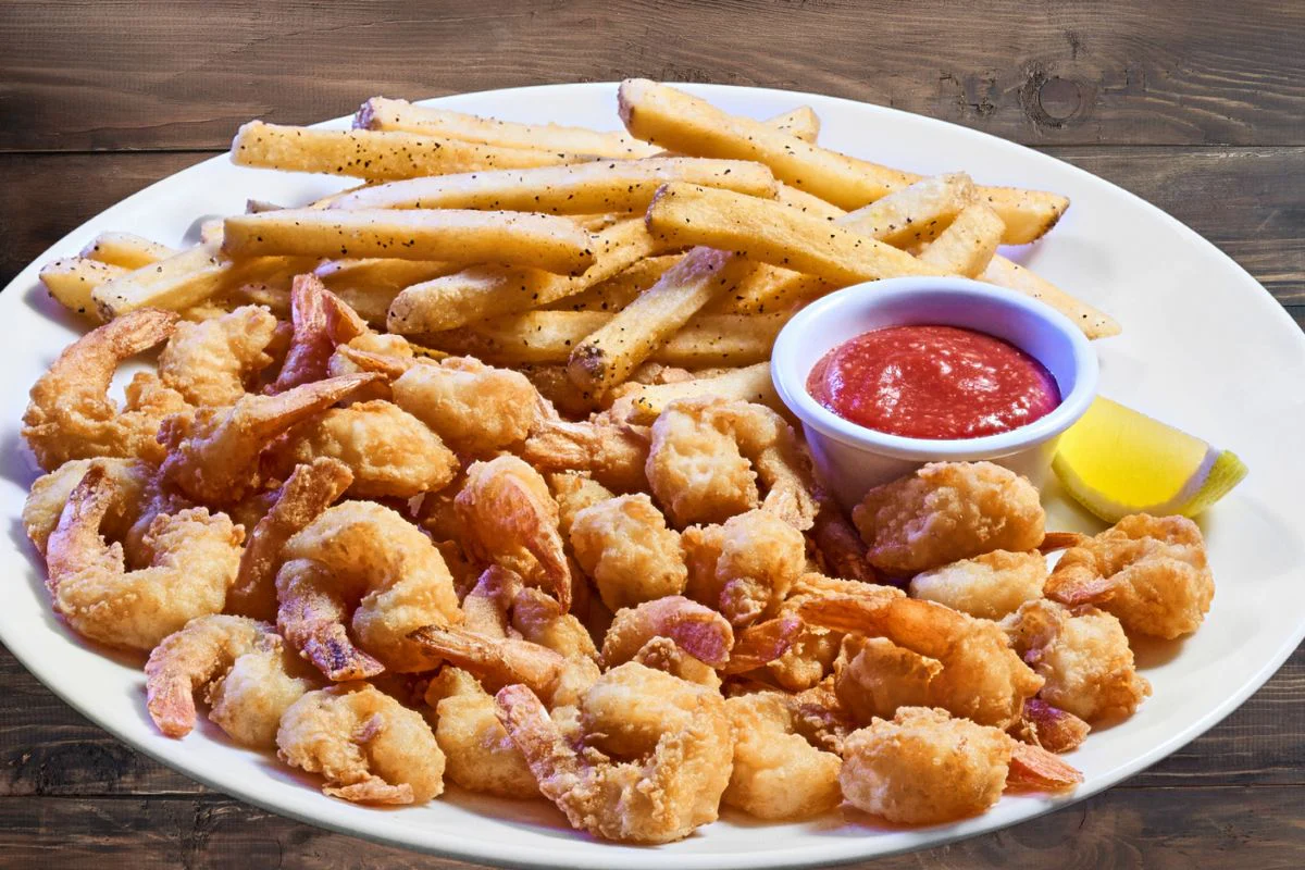 Seven golden fried shrimp served with a choice of one side, a kids beverage, and a complimentary scoop of vanilla ice cream.