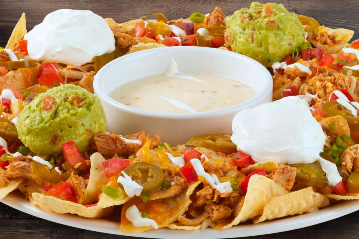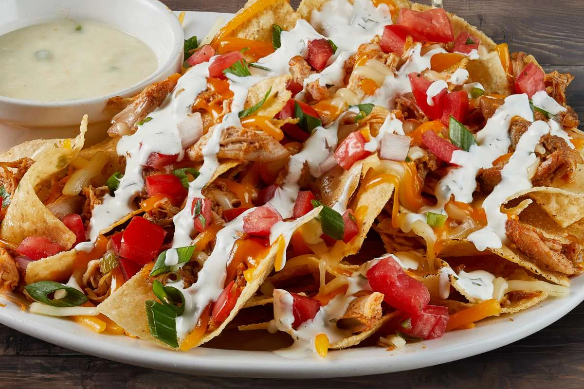 More of everything, and topped with guacamole, sour cream and jalapeños. Blended cheeses, tortilla chips, roasted chile spiced chicken, pico de gallo, scallions, and drizzled with garlic-lime crema. Served with a bowl of queso for dipping.