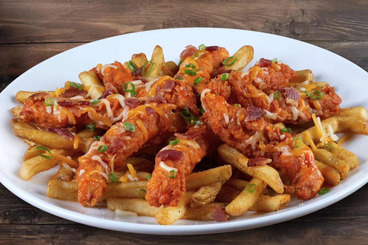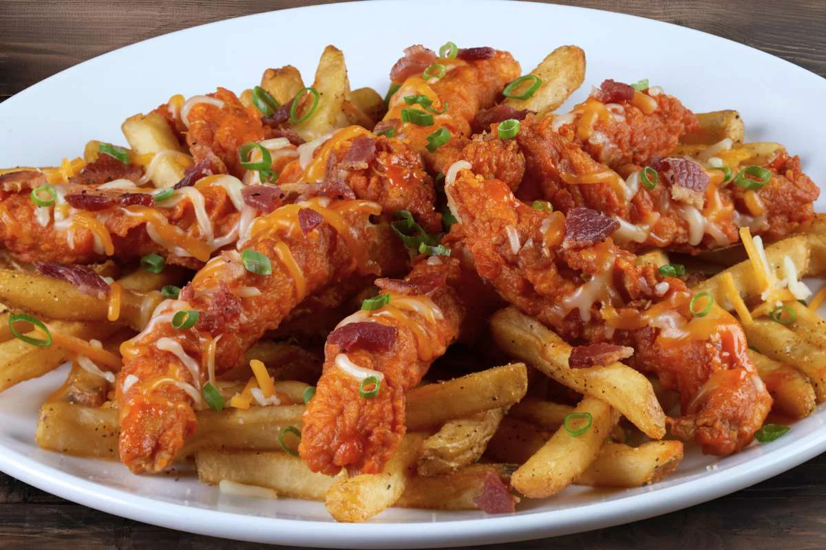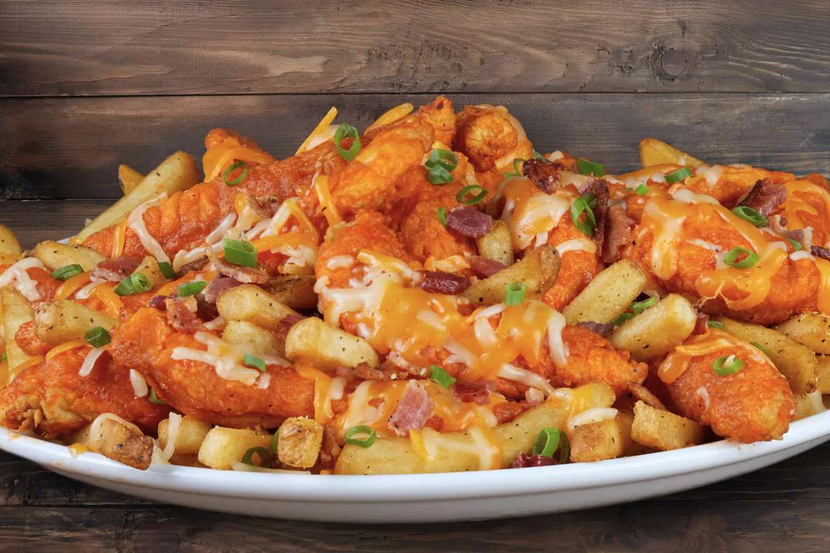 Zingers®, blended cheeses, applewood-smoked bacon and scallions on a mountain of fries.