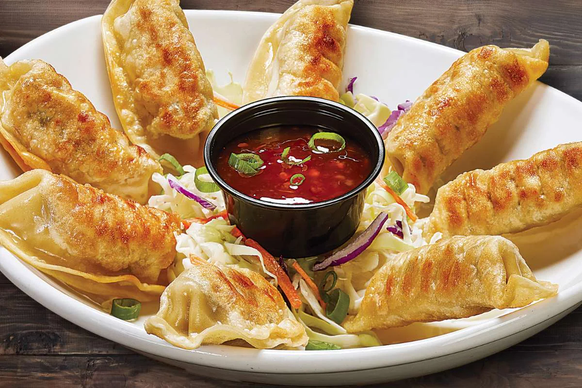 Pan fried; Pork dumplings, shredded cabbage, scallions, sweet Thai chili sauce.