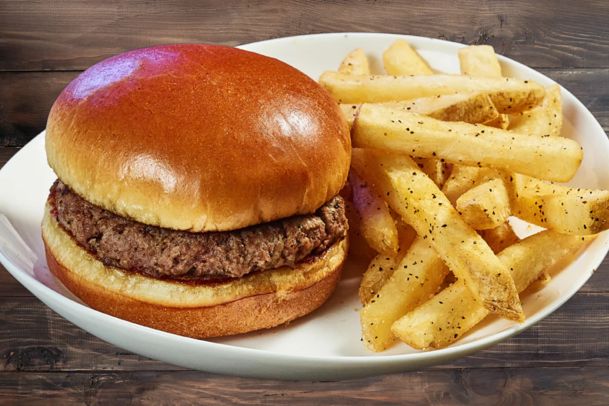 Juicy beef patty* on a soft bun, served with a choice of one side, a kids beverage, and a complimentary scoop of vanilla ice cream.