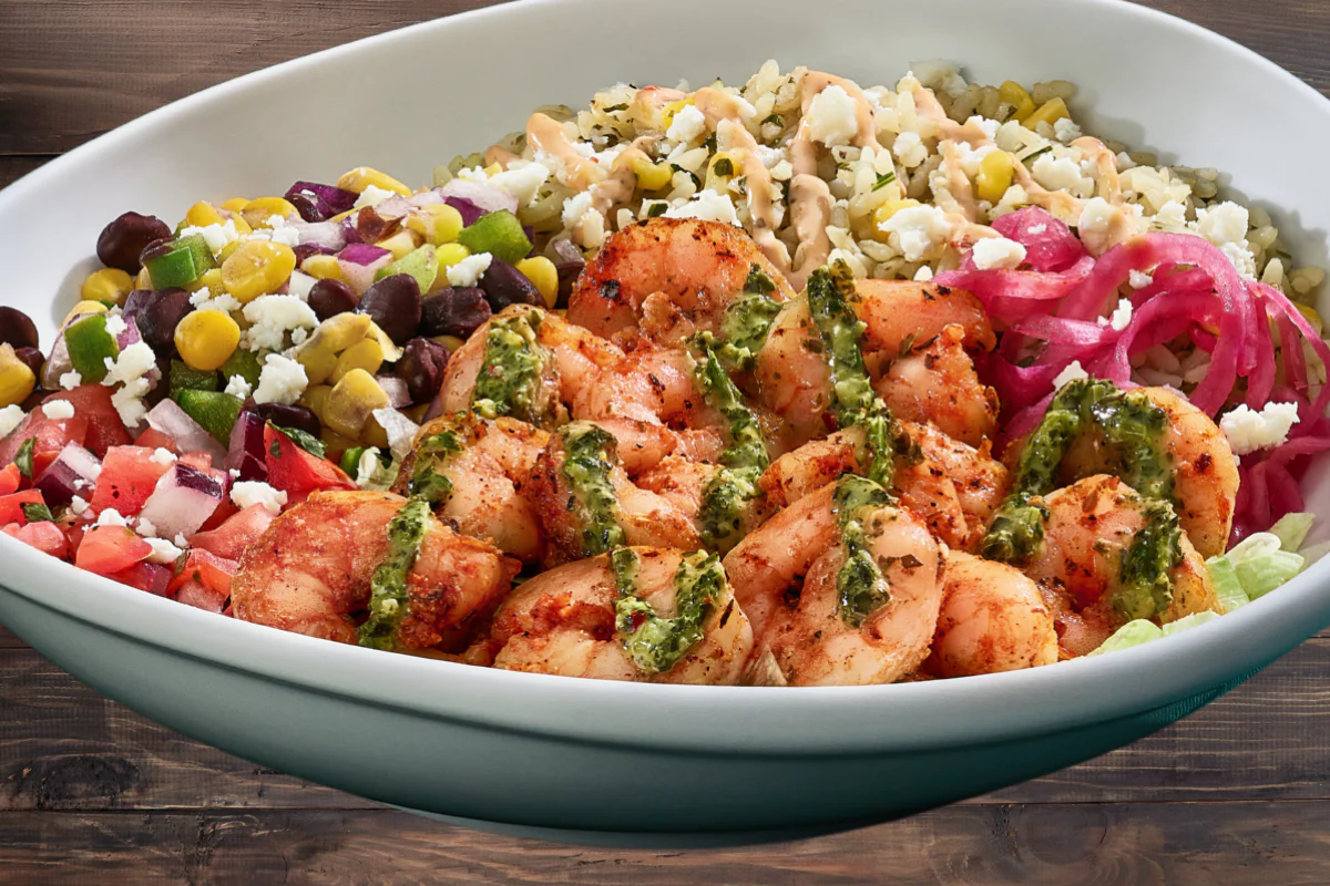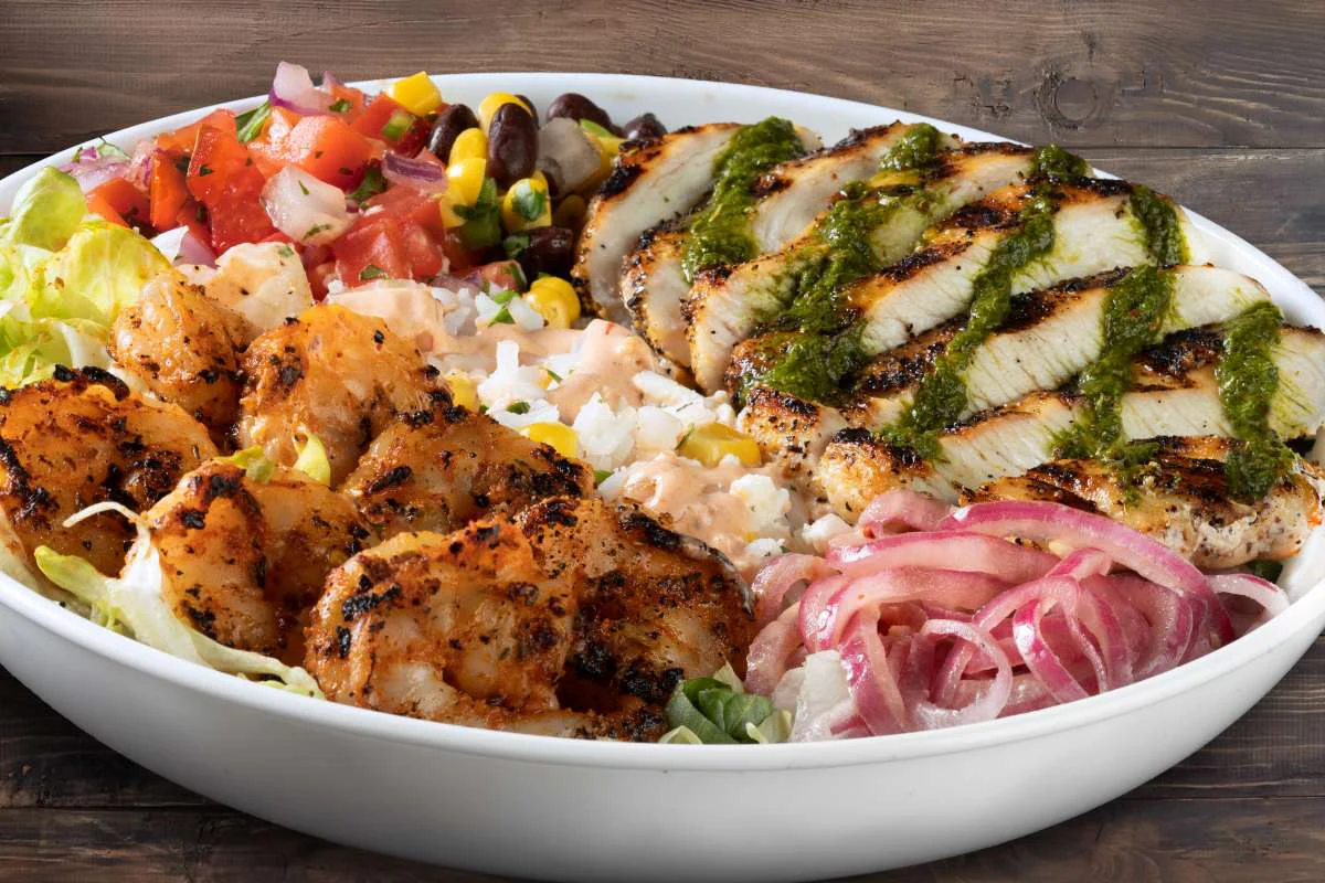 Grilled chicken breast, blackened shrimp, black bean corn salsa, cilantro lime rice, chimichurri, creamy red chili sauce, pickled red onions, shredded lettuce, pico de gallo, queso fresco cheese.