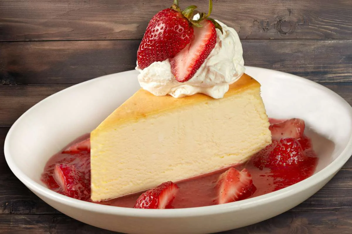 Toasted graham cracker crust, whipped cream cheese, served with a tangy, sweet strawberry sauce and fresh strawberries.