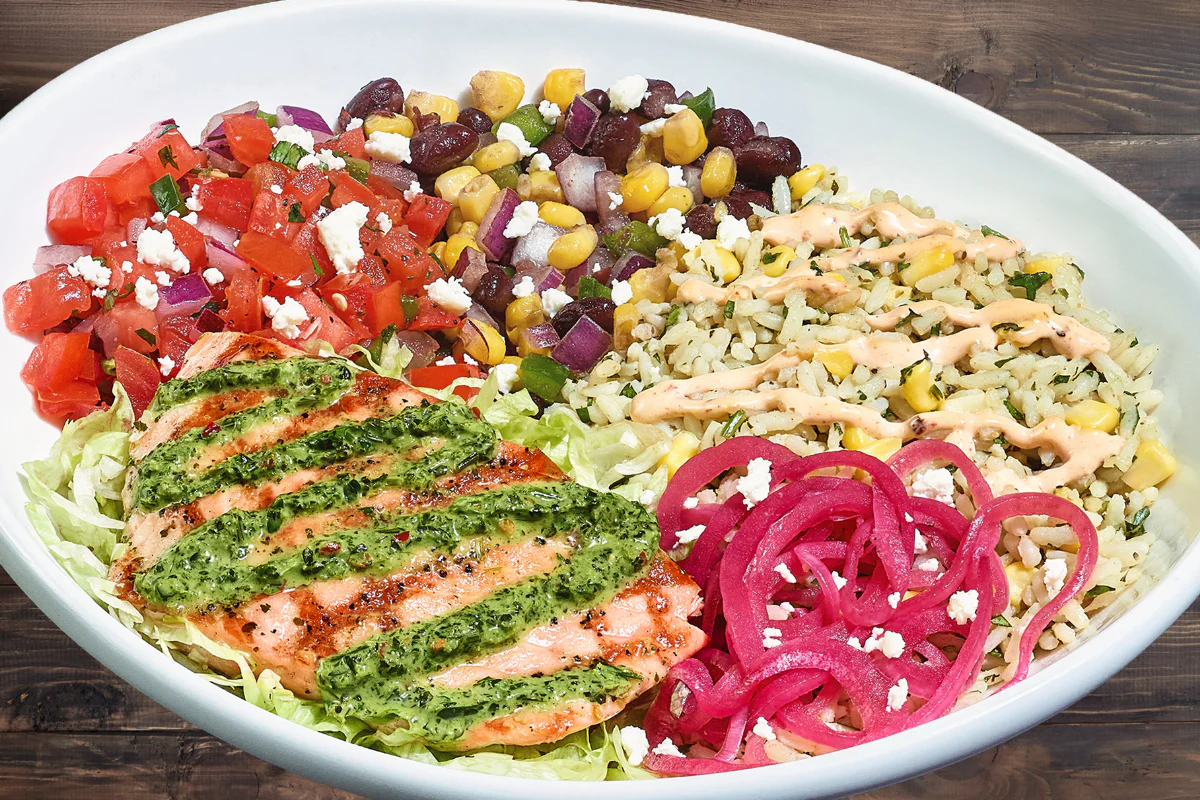 Grilled salmon*, black bean corn salsa, cilantro lime rice, chimichurri, creamy red chili sauce, pickled red onions, shredded lettuce, pico de gallo, queso fresco cheese.