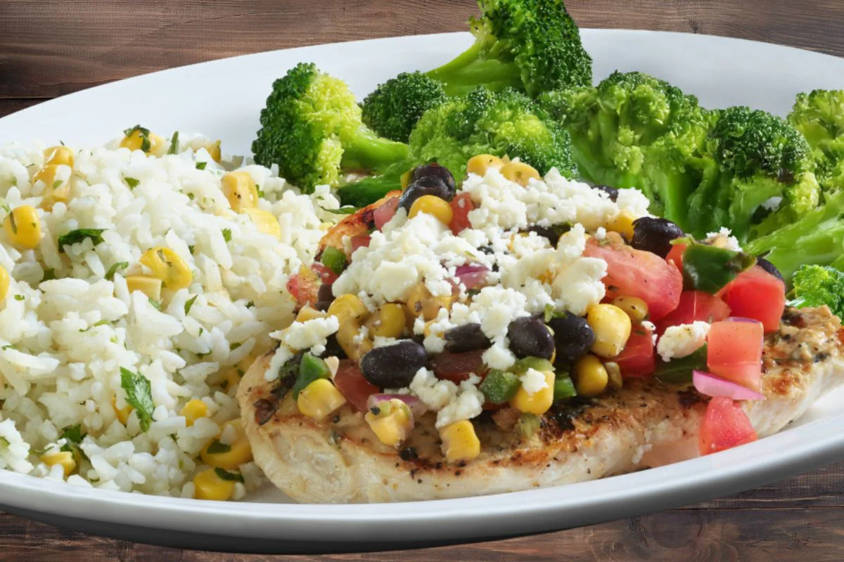 Grilled chicken breast, cilantro lime glaze, black bean corn salsa, pico de gallo, queso fresco cheese. Served with broccoli and cilantro lime rice.