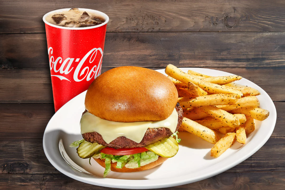 Our Classic Cheeseburger, side of fries and a fountain drink to go.
