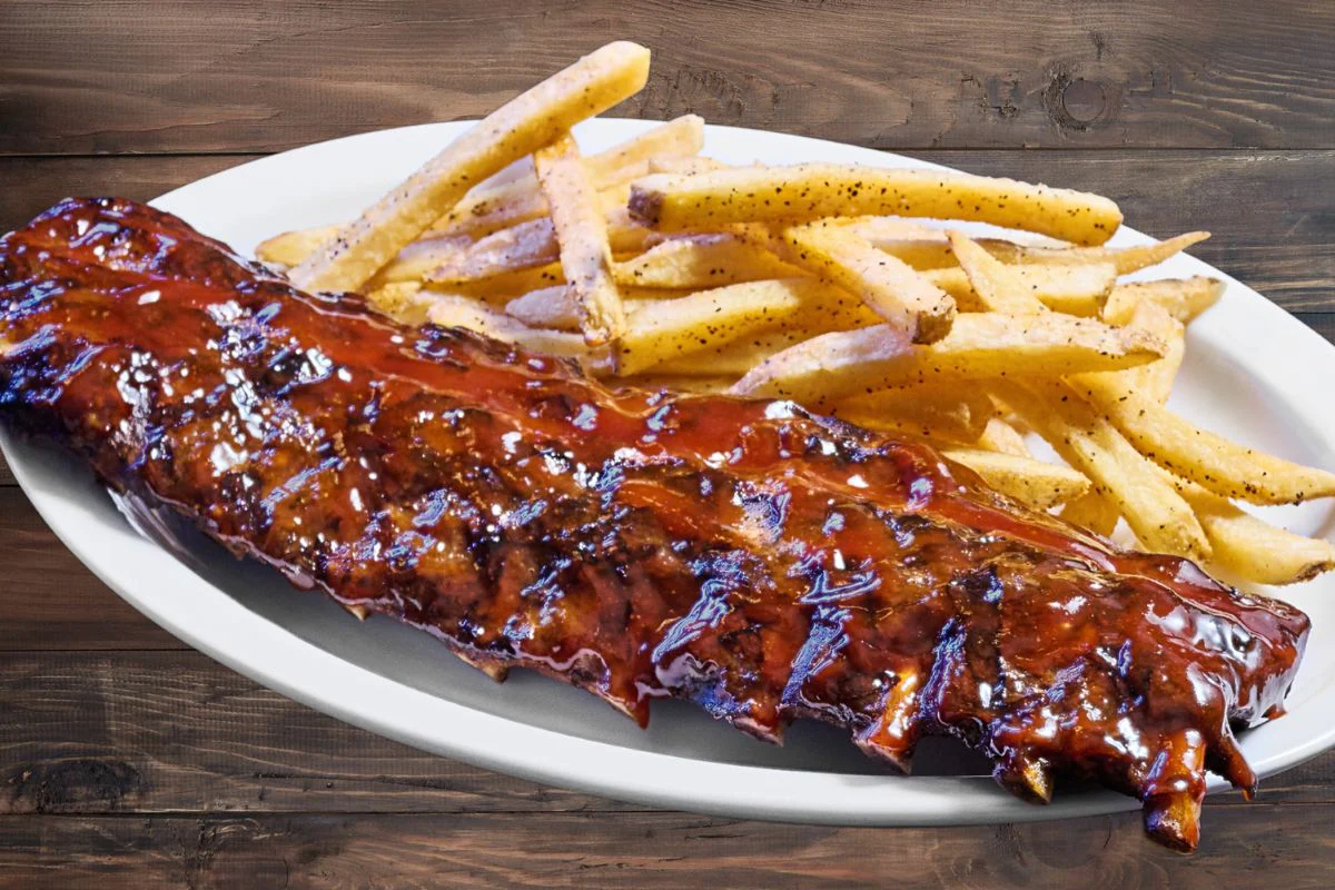 Full rack, slow-roasted, tender to the bone, basted in sweet and tangy bbq sauce, coleslaw. Served with a choice of one side.