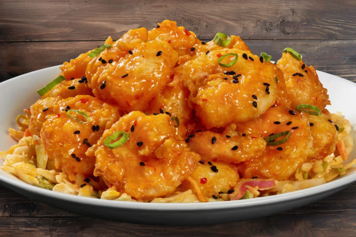 20 Fried shrimp tossed in spicy boom boom sauce on a crunchy cabbage slaw. Topped with black sesame seeds.